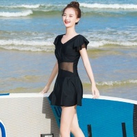 自帶胸墊 自帶安全褲 終於找到不尷尬的保守泳衣 連體裙式 荷葉袖 網紗腰藏肚 V領露鎖骨 露背又不暴露 保守派也能美到發光