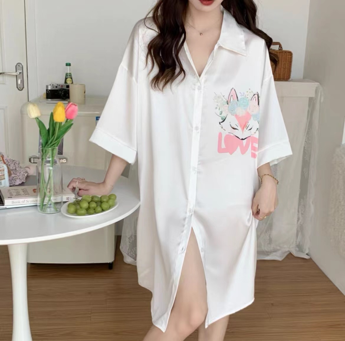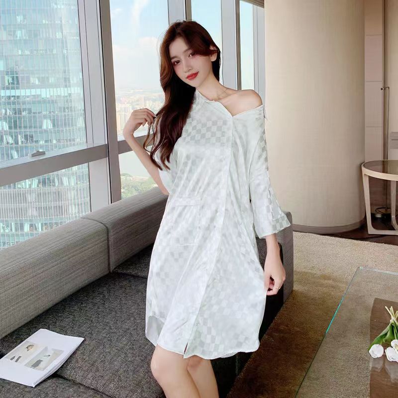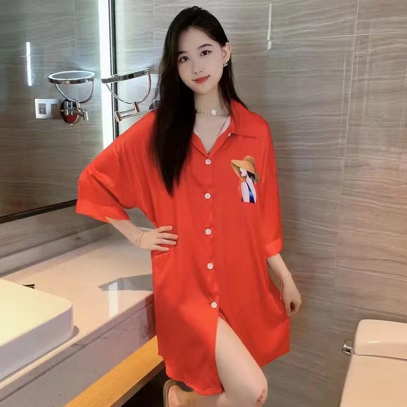 春夏蕾絲睡裙 冰絲短袖薄款寬鬆 性感襯衫睡衣裙