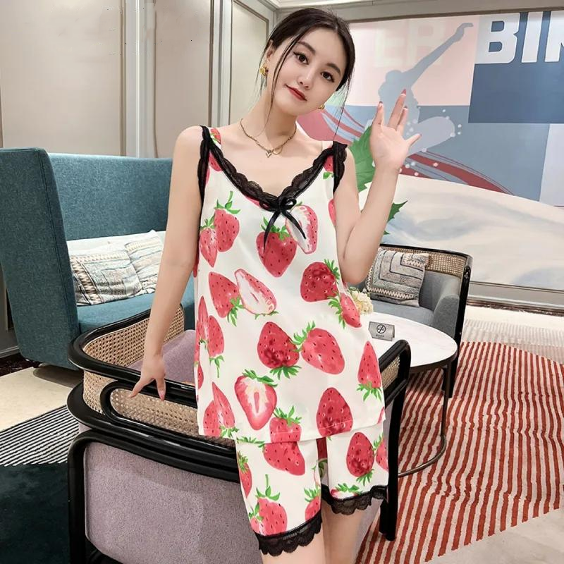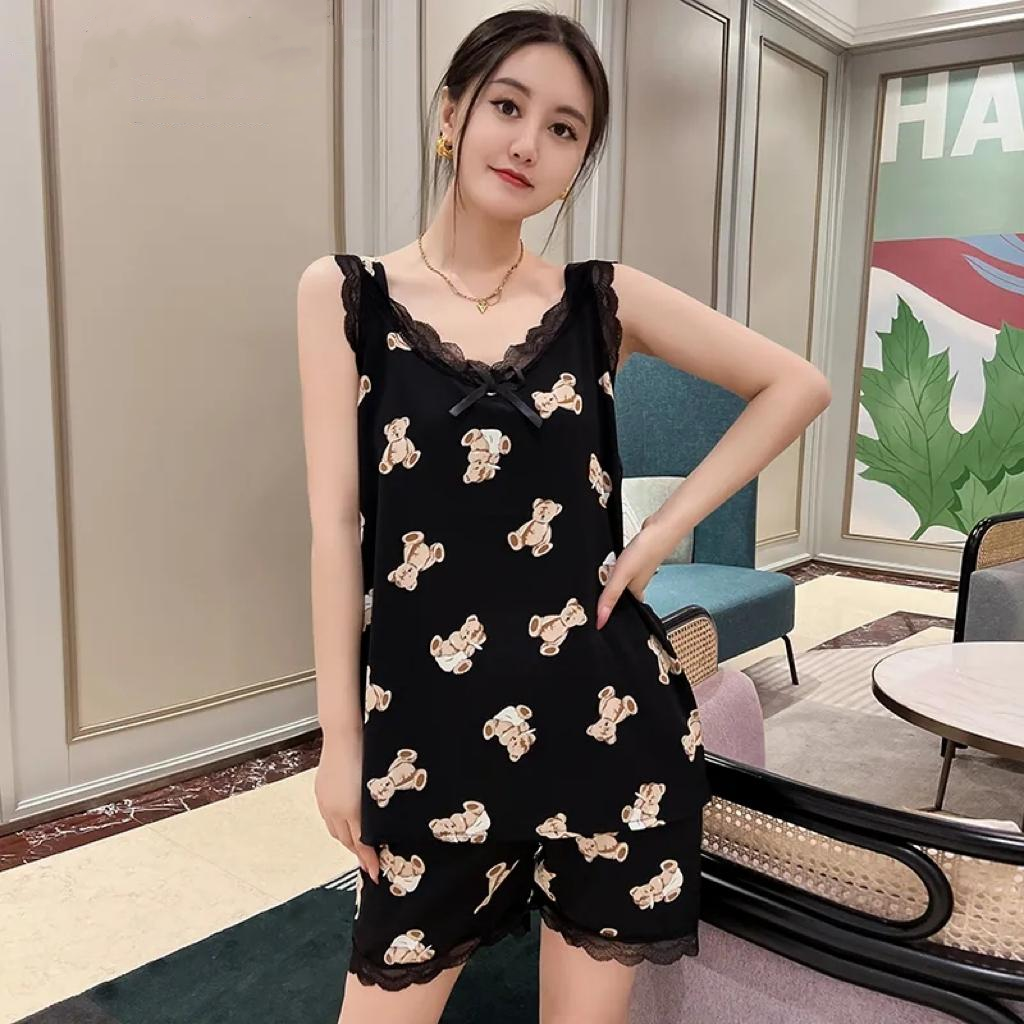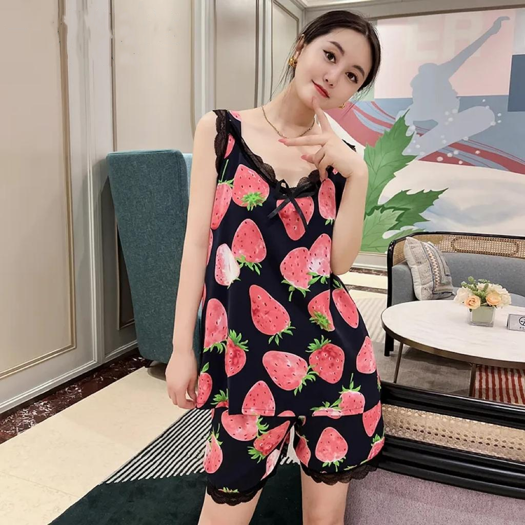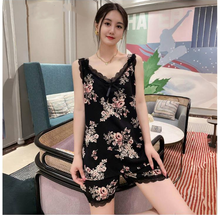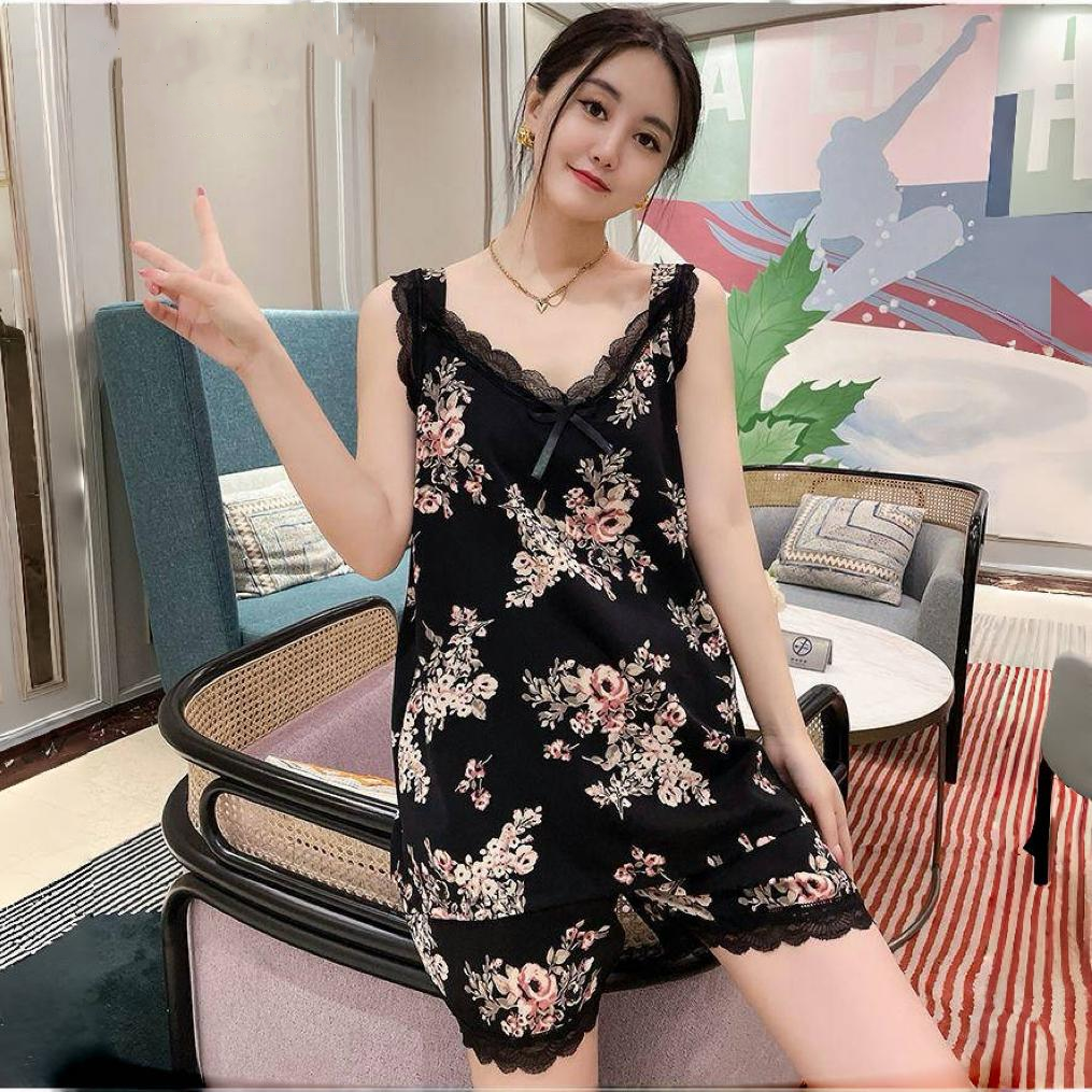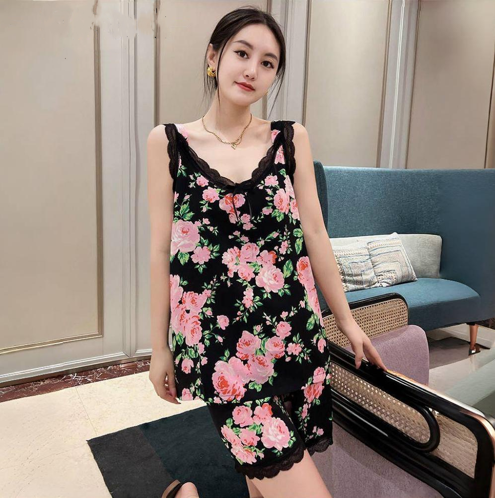 爆款睡衣女夏季新款v領印花吊帶短褲套裝時尚年輕寬鬆大碼家居服